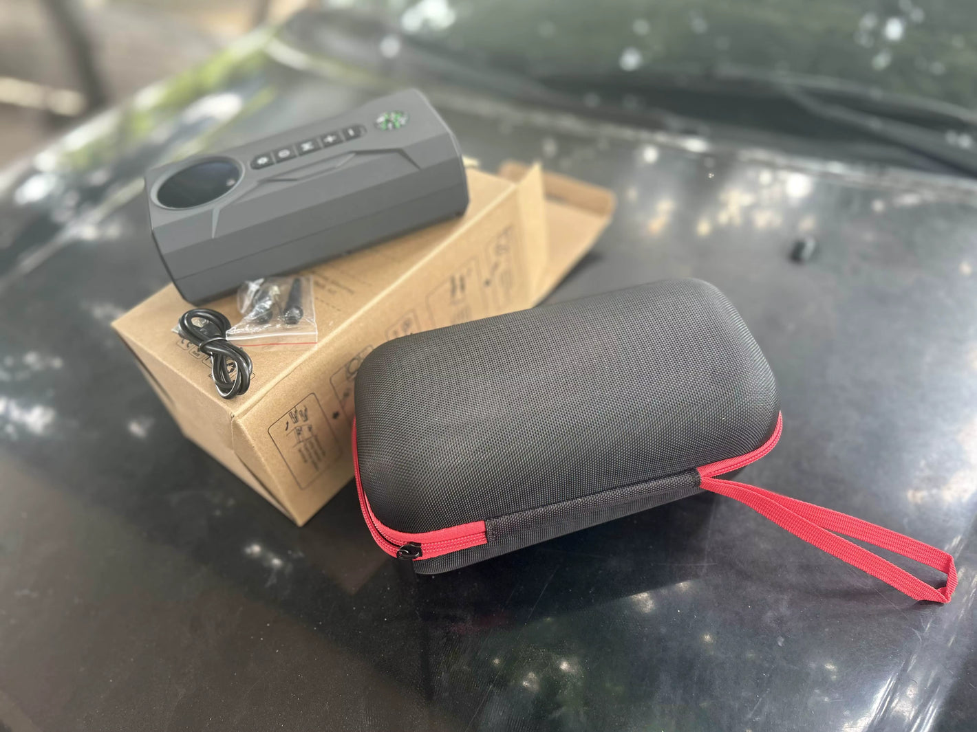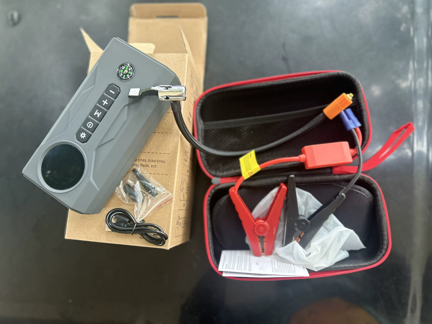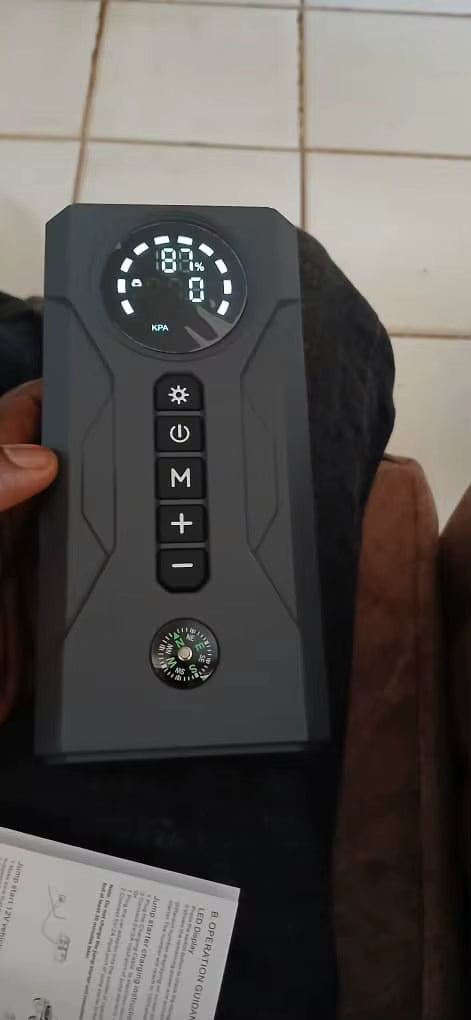Este dispositivo reúne num só corpo as quatro funções essenciais que qualquer condutor prudente deve ter por perto: arranque de emergência, compressor de ar, power bank e lanterna LED.